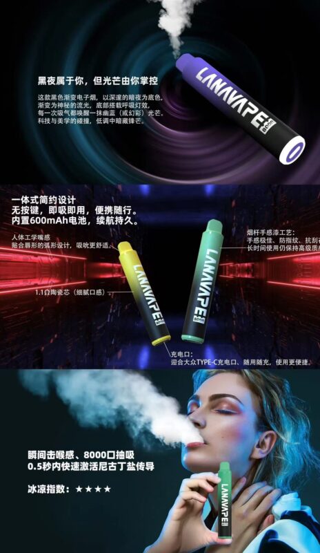 LANA品牌再度突破,重磅推出全新 8000口大容量一次性拋棄式電子煙,為電子煙愛好者帶來無與倫比的便捷與享受!這款LANA 8000口電子煙完美結合了高容量設計與現代科技,850mAh大容量電池 搭配 15ml煙油,充分滿足長時間的使用需求,讓每一次吸霧都舒適流暢。